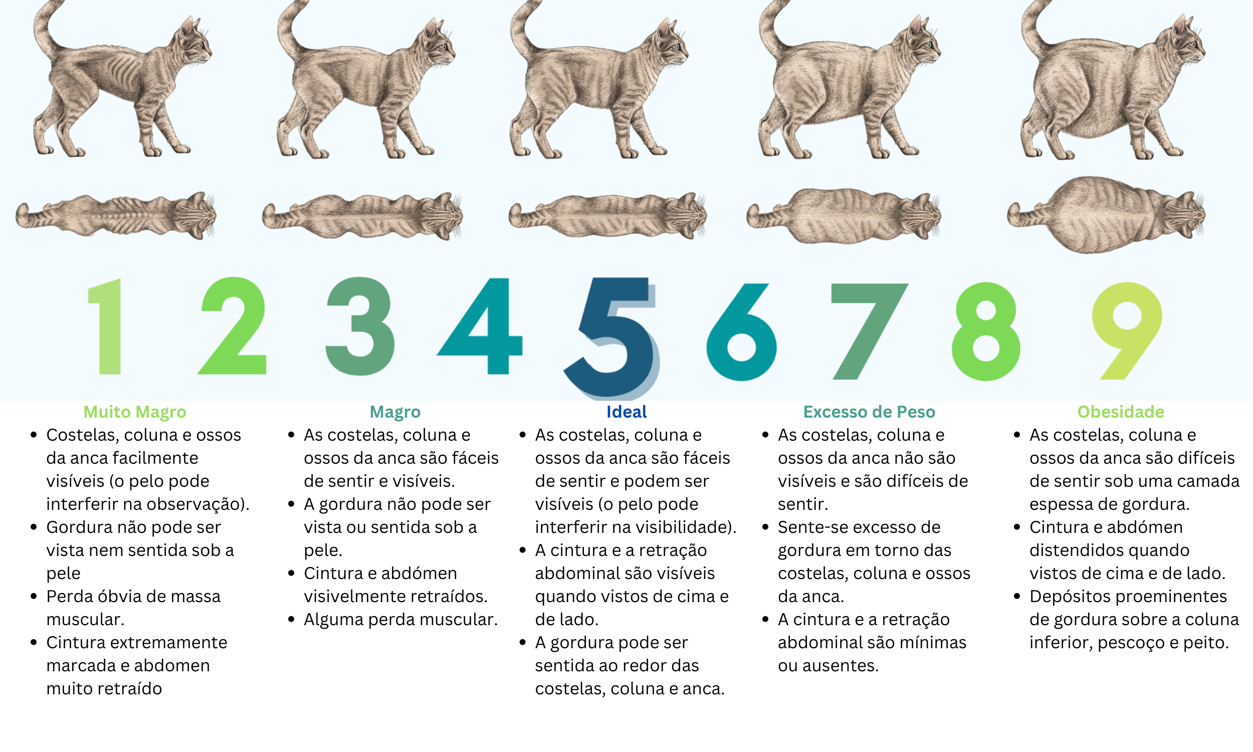 Condição Corporal: Utiliza uma escala de "Body Condition Score" (BCS) de 1 a 9 para determinar se o animal está magro, ideal ou com excesso de peso.
