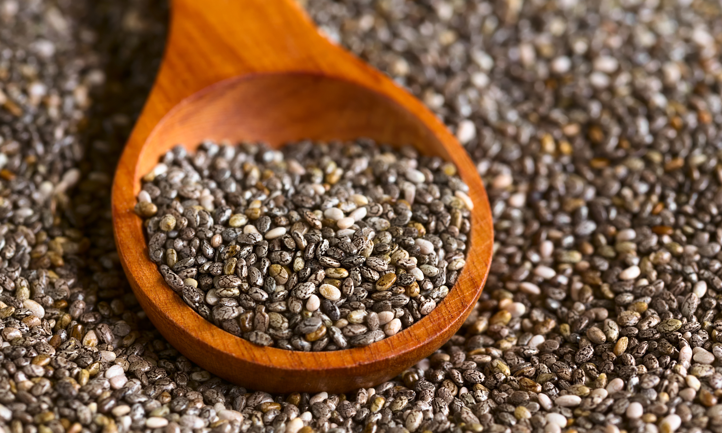 Hidratação: Mistura 1 colher de sobremesa de sementes de chia com 4-5 colheres de sobremesa de água e deixa repousar por 30 minutos a 2 horas, até formar um gel.